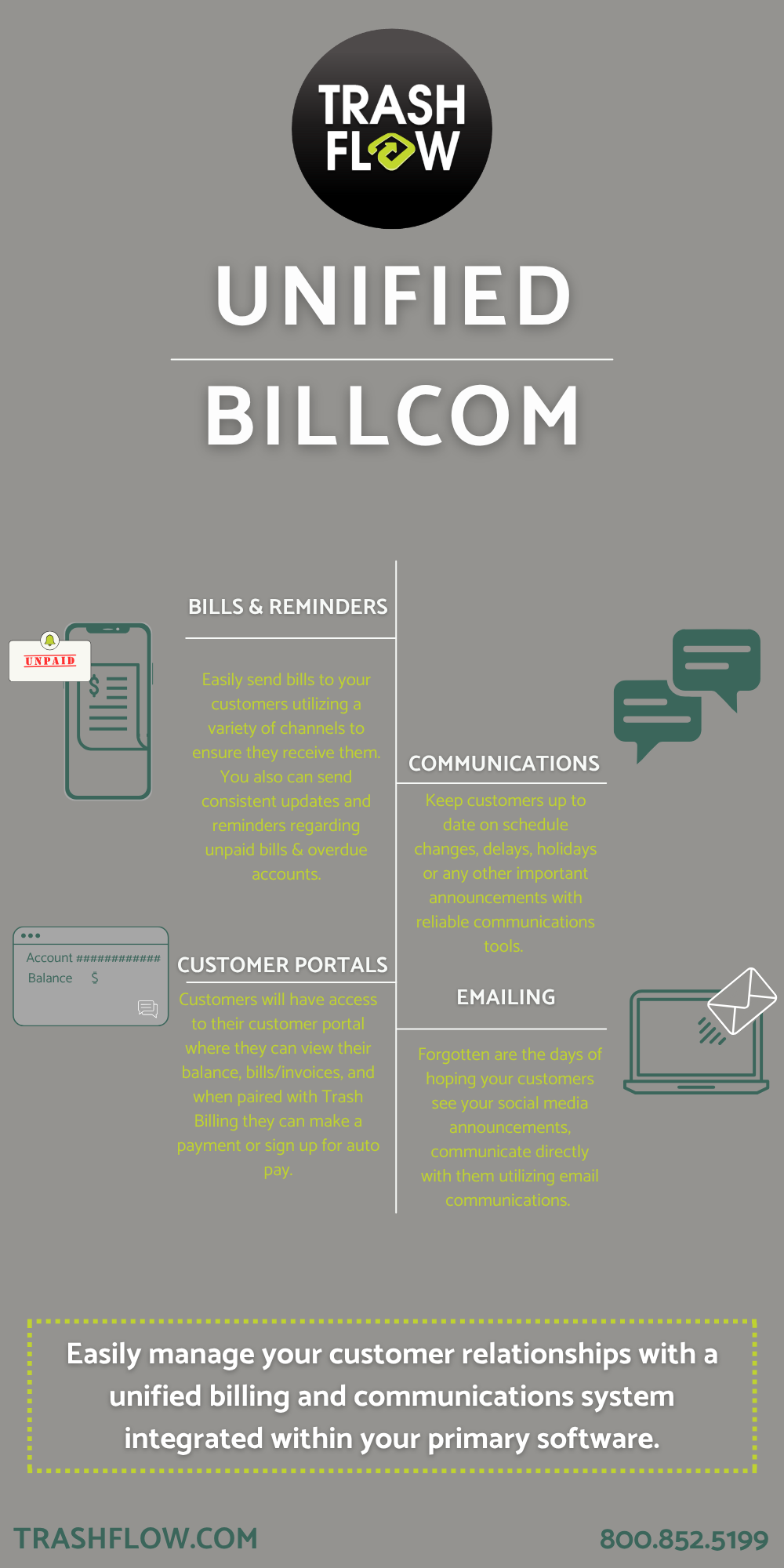 Trash Flows Trash Billing payment processing system and Unified BillCom service has the tools you need to succeed.
